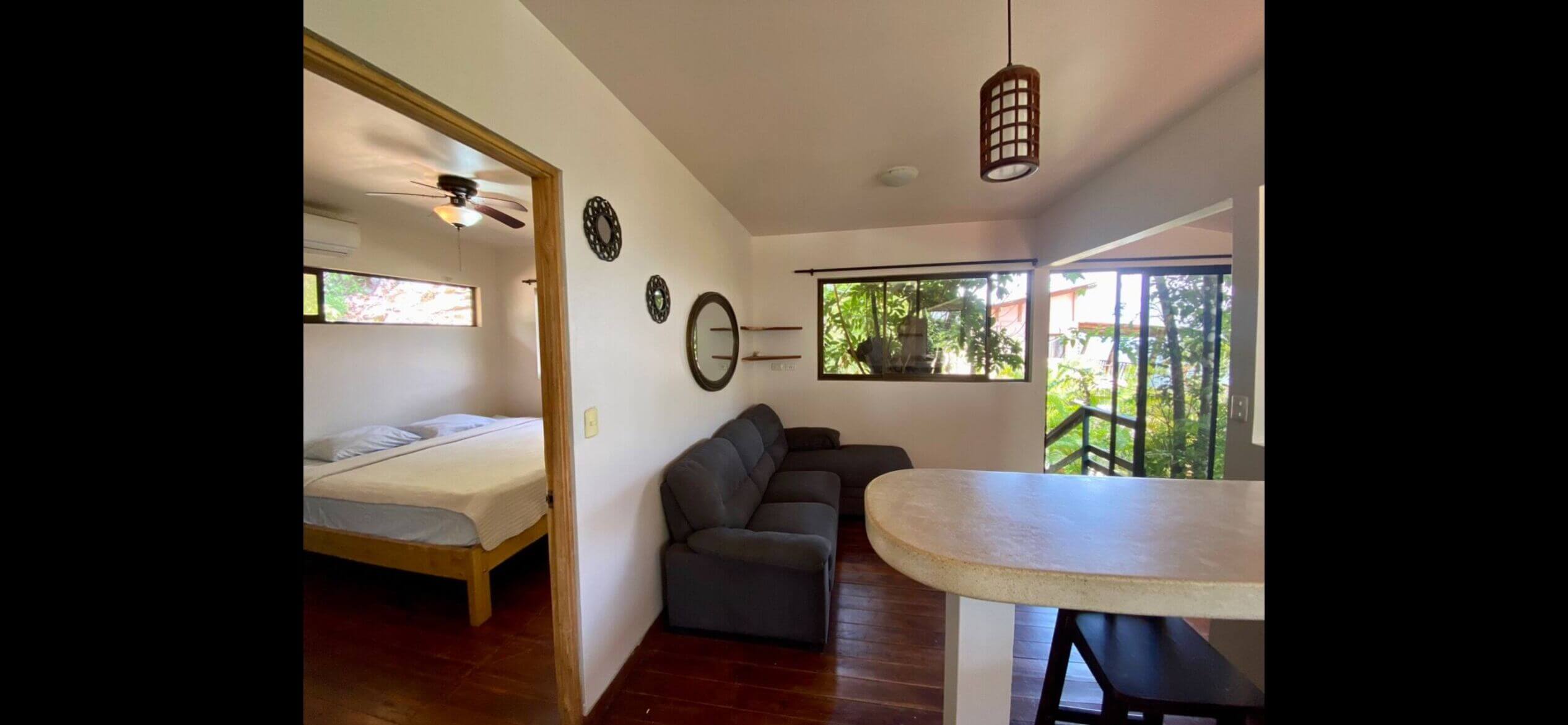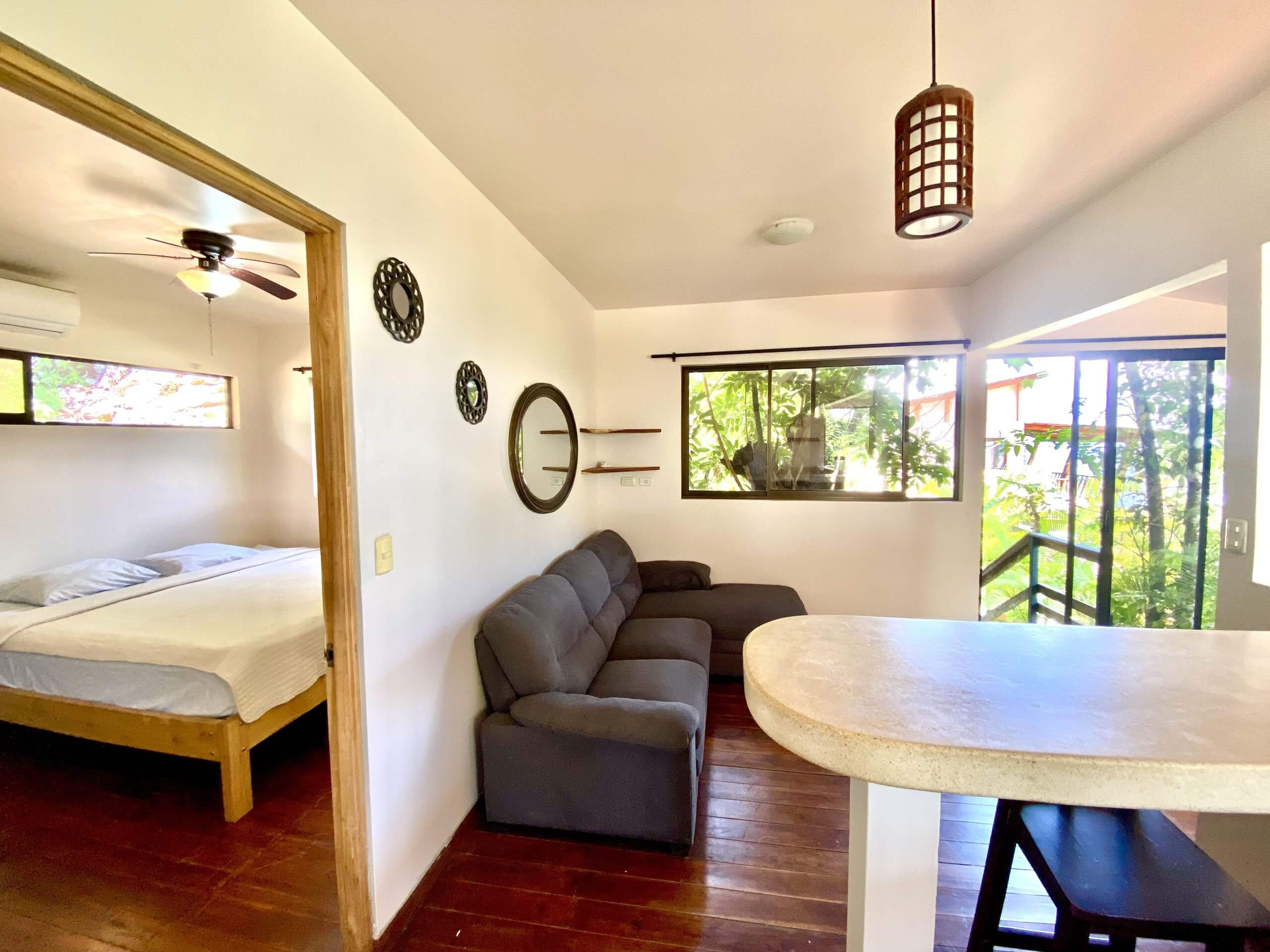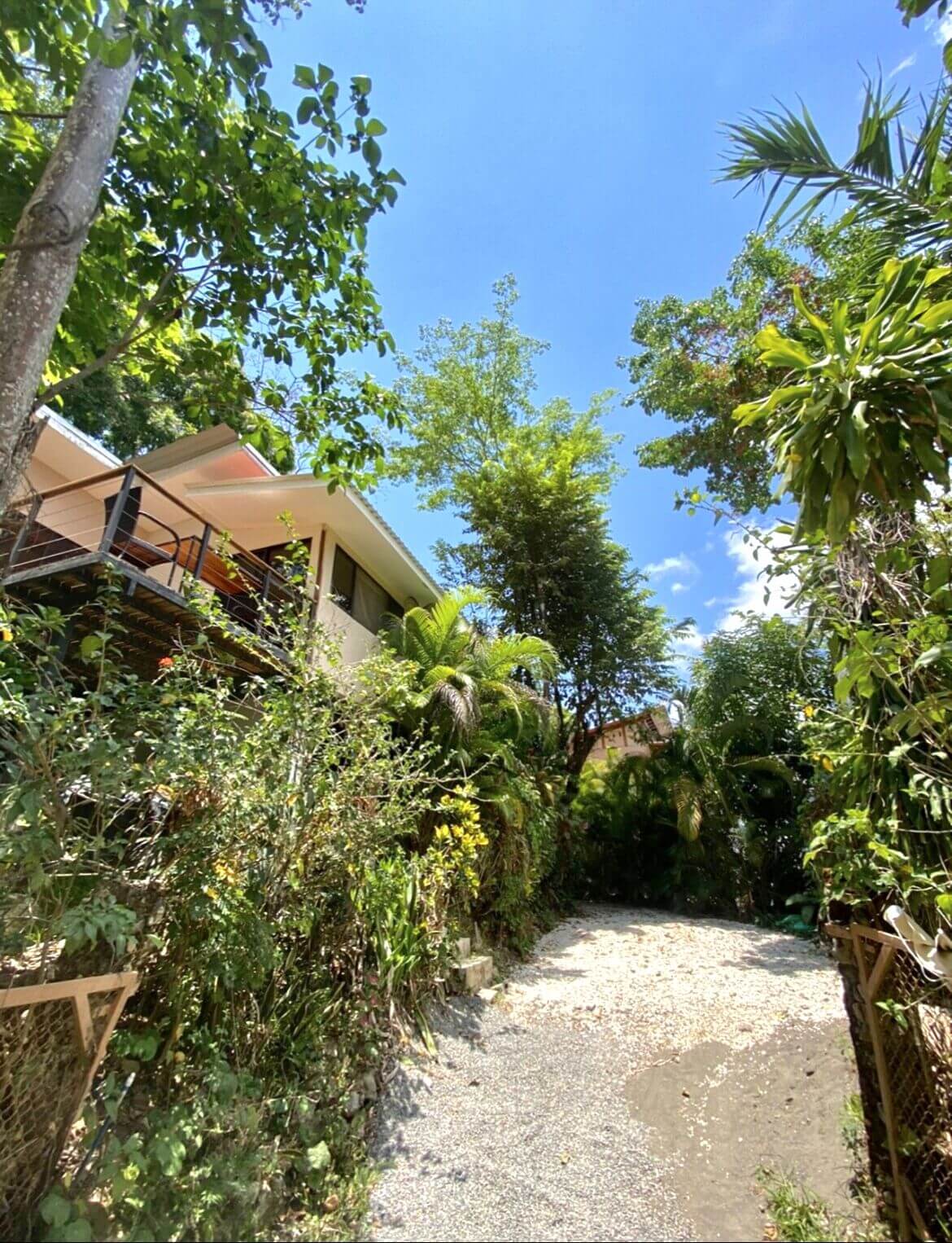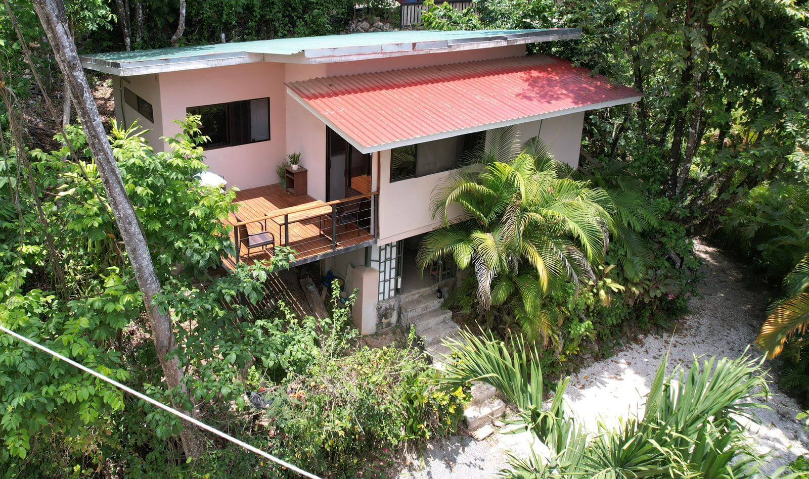 This home is just minutes up from the center of town/beaches (1km, 3min)…nice quiet area with views, hiking trails, and fast internet just above the hustle and bustle of town…Listen to and check the surf from the deck! 🙂